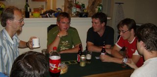 Wie schaut ein Wochenende eigentlich aus, bei dem keine Feiern sind? Also ein einzelner Tag eines Wochenendes, an dem grade keine Feier ist. *g* Meist ergibt sich da eine muntere Runde aus Pokern und Computerfußball. Hier zu sehen ist eine zünftige Runde Texas Hold 'em. Und ja, der Stapel Geld vor mir ist dreimal so hoch wie der der anderen, weil "jemand" (ohne Namen nennen zu wollen) halt kein Spielgefühl besitzt... *g*